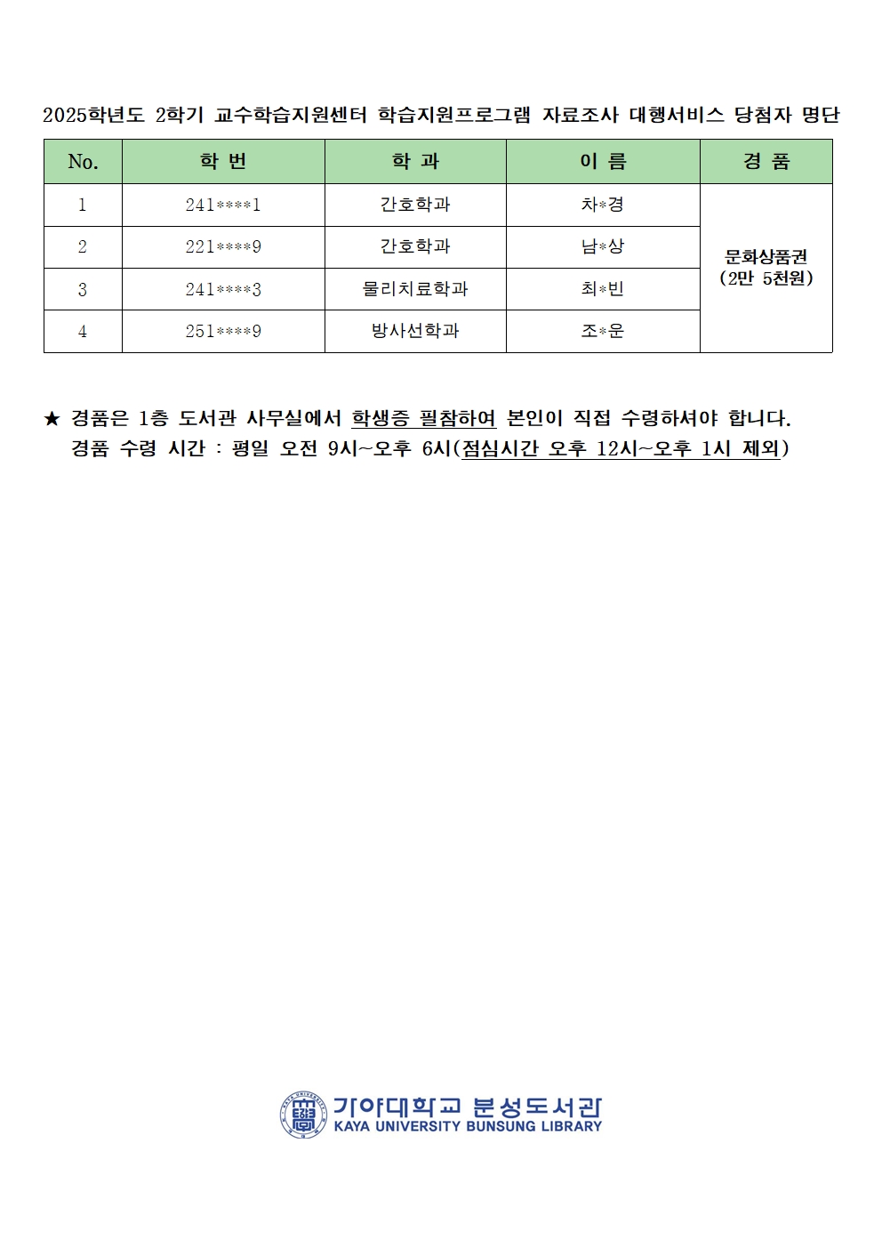 2025학년도 2학기 자료조사 대행서비스 경품 당첨자 안내