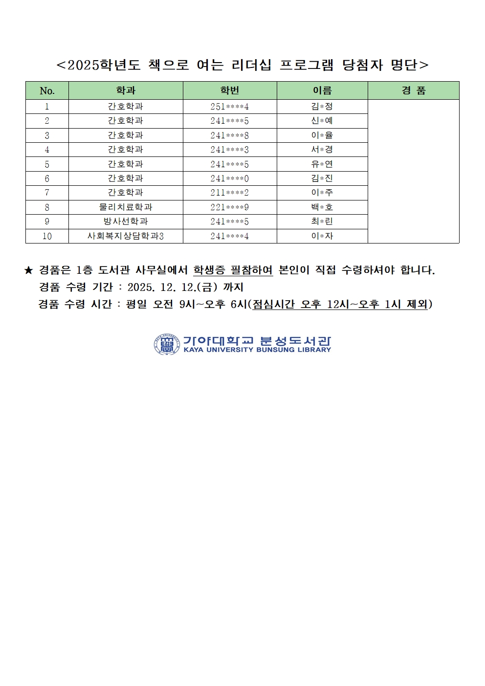 2025학년도 도서관 설문조사 경품 당첨자 안내